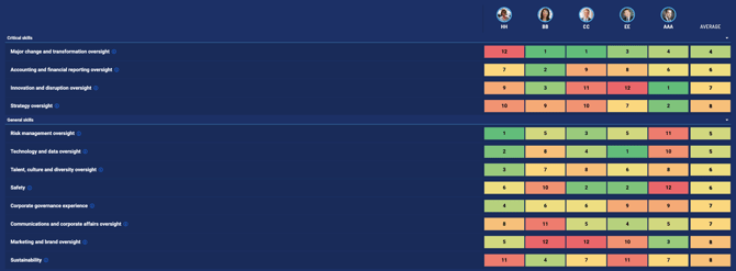 Each director was asked to rank their skills from strongest to weakest. This heat map highlights the areas where individuals felt most confident (shown in green) and areas where they felt least confident (shown in red).