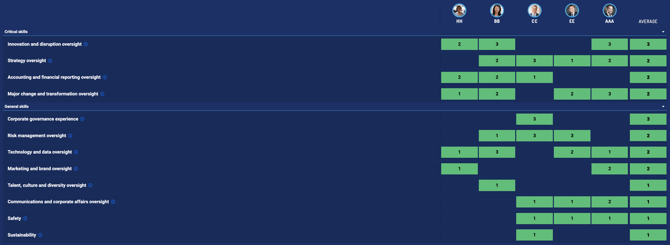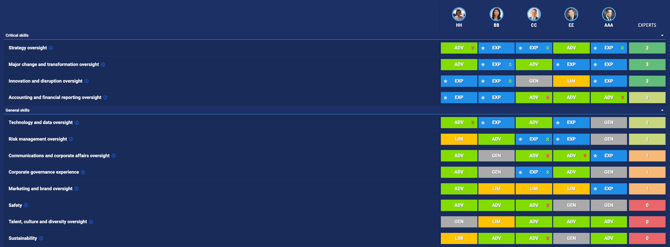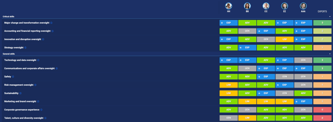 If a director has not self-identified as an expert, but 30% or more of their board peers have recognised them as one, the matrix will reflect this with a green arrow and moderate their capability level up by one level. Conversely, if a director has self-identified as an expert but fewer than 30% of their peers validate this, a red arrow will appear, indicating that their capability level has been moderated down by one level.